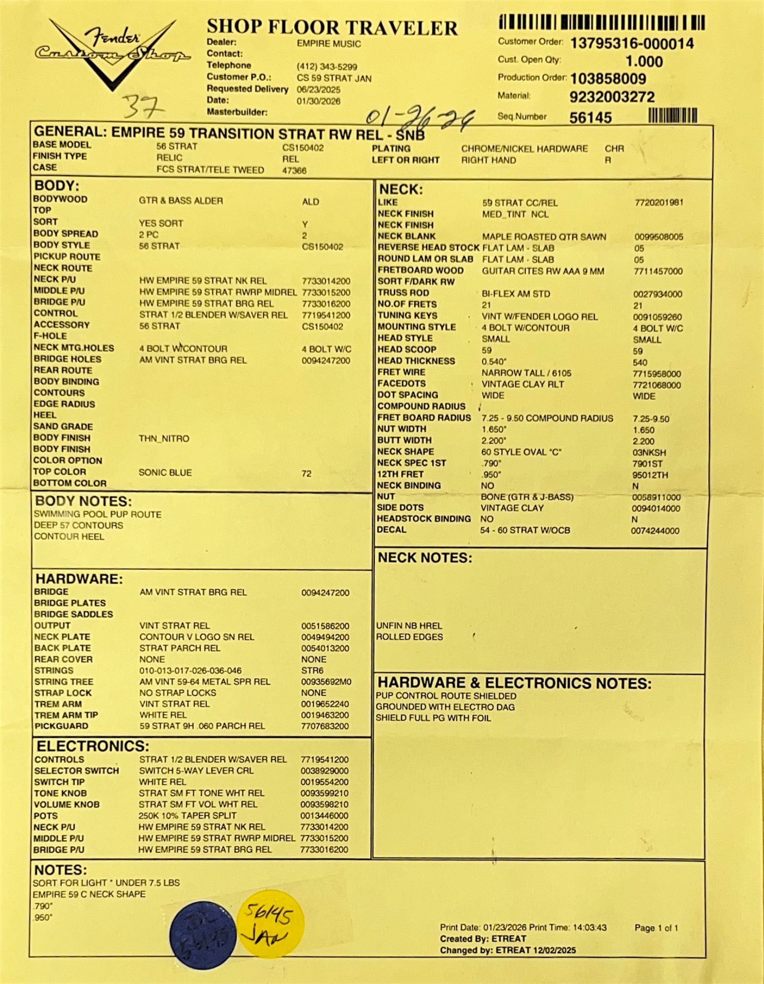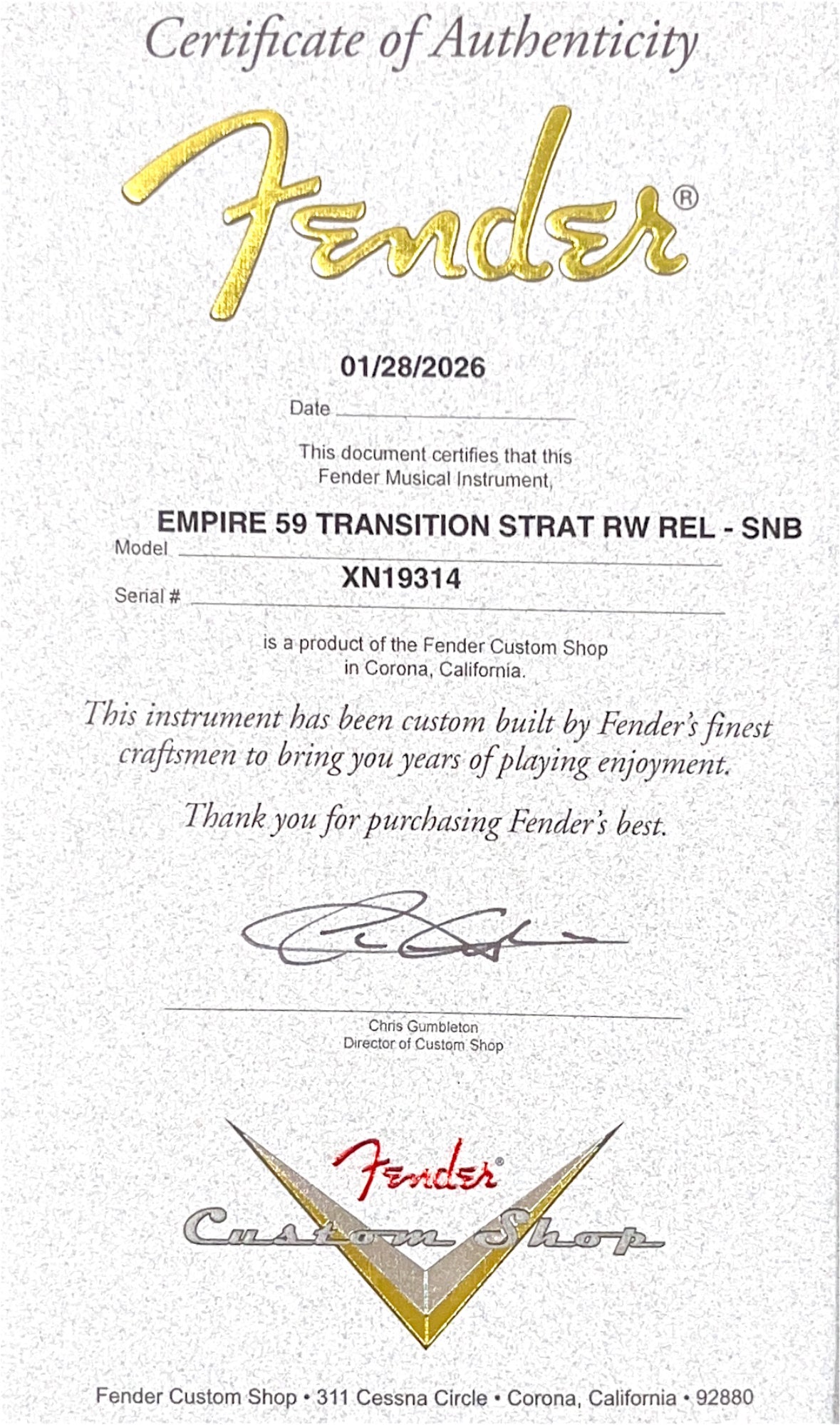 “For over 25 years, the Strat has been my go-to. The look, sound, and versatility of the Stratocaster, and the iconic heroes who play them, has been at the foundation of my experience as a musician. The Empire ‘59 Transition Strat draws on everything I love about the most expressive guitars ever made. Players will appreciate the familiar played-in neck and body feel, and the maturity and sweetness of our hand wound ‘59 pickups. These Strats are among the best I’ve played, and are a tribute to the deep connection between the Fender Stratocaster and the musicians who play them” - Justin, Empire Music