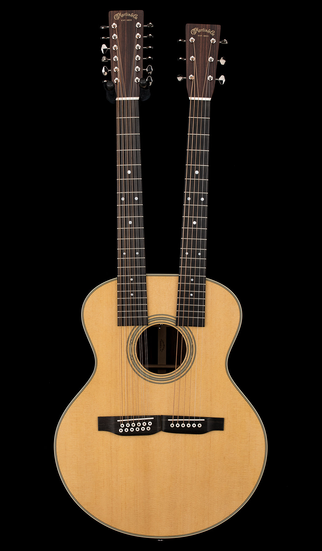 This double-neck guitar took years to perfect, and thanks to cutting-edge technology at Martin's Nazareth factory, the Grand J-28E DN, featuring two compound dovetail neck joints and unique X bracing, is now available to the public. Both necks feature a smooth satin finish and ebony fingerboard, with the six-string neck offering a slightly slimmer profile at the nut. It also includes built-in custom Fishman® electronics, making it ready for the stage and studio. With classic 28-style appointments and endless sonic possibilities, this guitar is a dream for players seeking an extraordinary instrument that’s anything but standard.