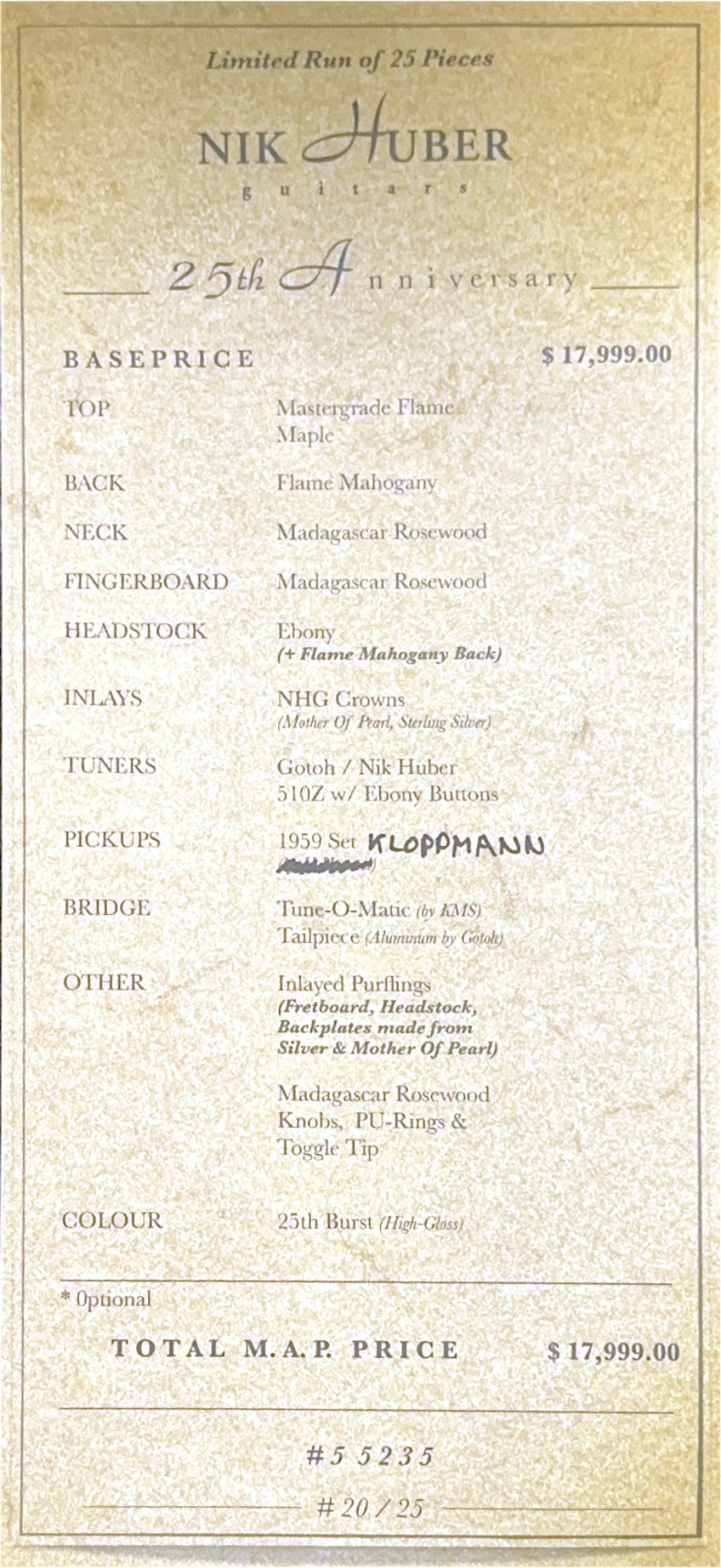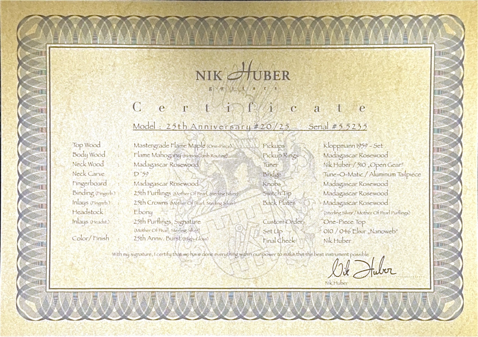 "Time flies, and in the blink of an eye our little company has reached another milestone. To be able to build guitars with this incredible team is a real privilege, and to make a living building guitars – or following whatever your passion is – is never easy. So to have reached a quarter of a century of Nik Huber Guitars is something special – and we thought we’d better mark the occasion with a particularly special guitar." - Nik Huber