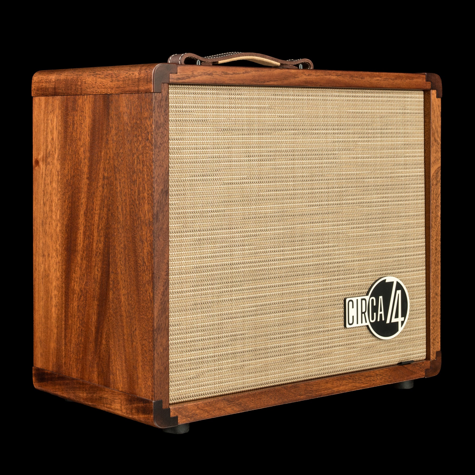 The warm sonic characteristics are matched visually by the cabinet (mahogany or ebony/mahogany), with clean lines and rich wood texture reminiscent of mid-century modern furniture design. The aesthetic is enhanced by the modern-retro fabric grill cloth and an equally gorgeous wood stand designed to complement the amp.