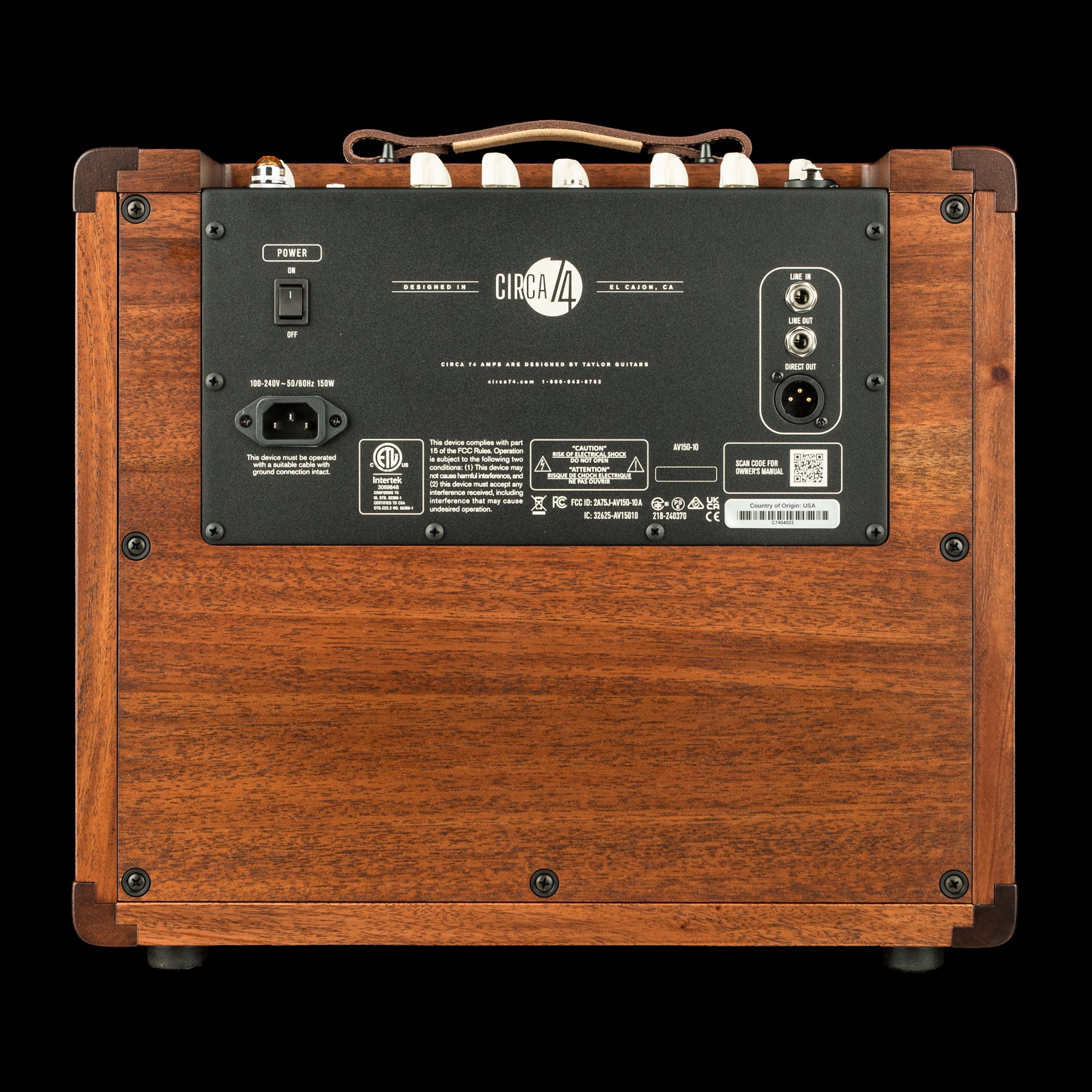 The Circa 74 amp was designed to dial down the high-end harshness found in many acoustic amps and produce a warm, analog musical character. The sound is smooth, yet without sacrificing articulation. One important material choice was to build a wood cabinet for the amp — choose from mahogany or ebony/mahogany — leveraging Taylor’s tonewood voicing expertise to contribute to the amp’s smooth sound palette and room-filling sound.