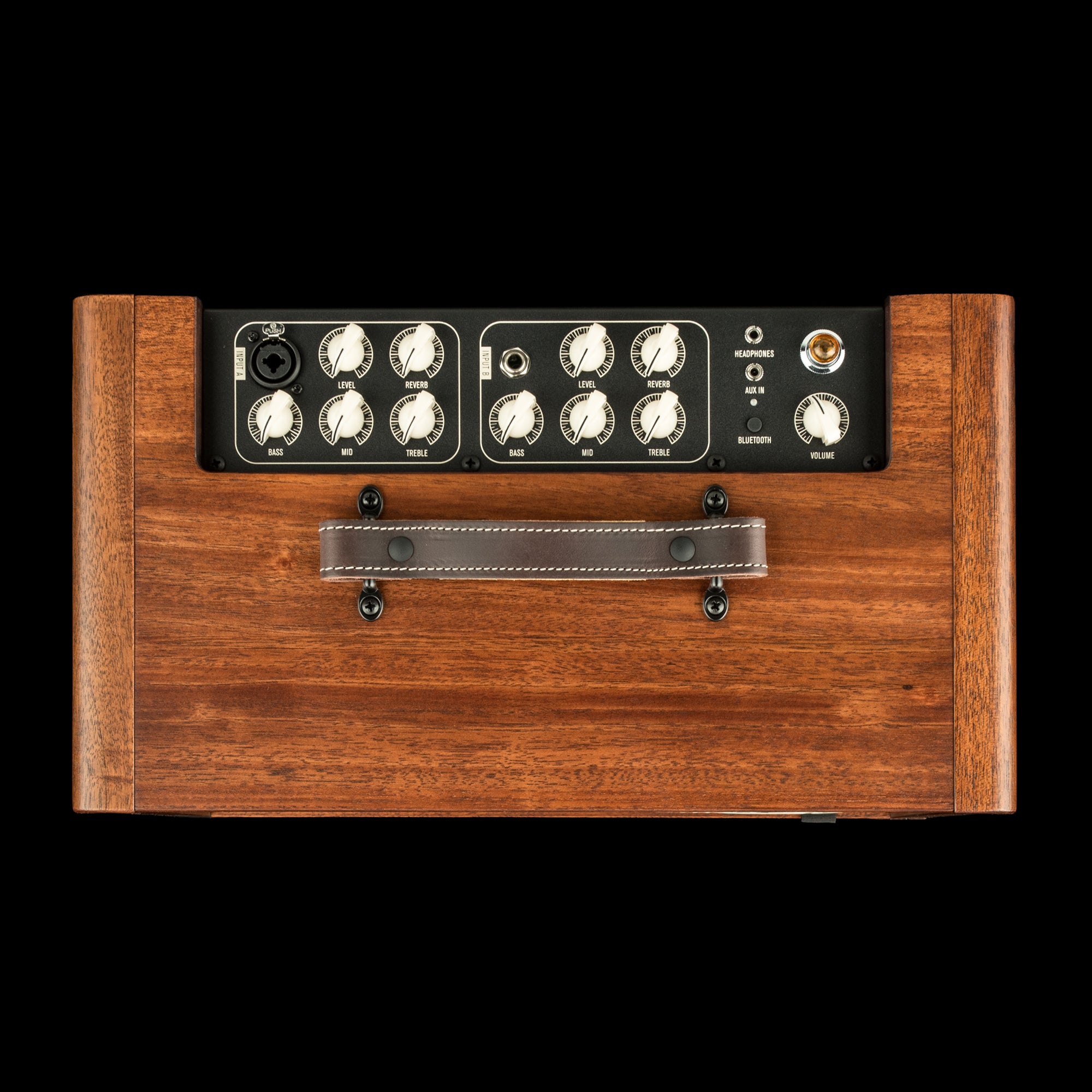 The idea: Build a great-sounding acoustic guitar amp you can also sing through. The guiding design thoughts: Make it compatible with a wide range of acoustic guitar pickups and playing environments. Make it practical and easy to use, without over-engineering it with too many controls or effects. Make the cabinet from an acoustic guitar tonewood to bring an extra warm, smooth sonic character to the amplified tone. Give it the elegant aesthetic appeal of a finely crafted piece of furniture. And add Bluetooth connectivity to stream music and play or sing along.