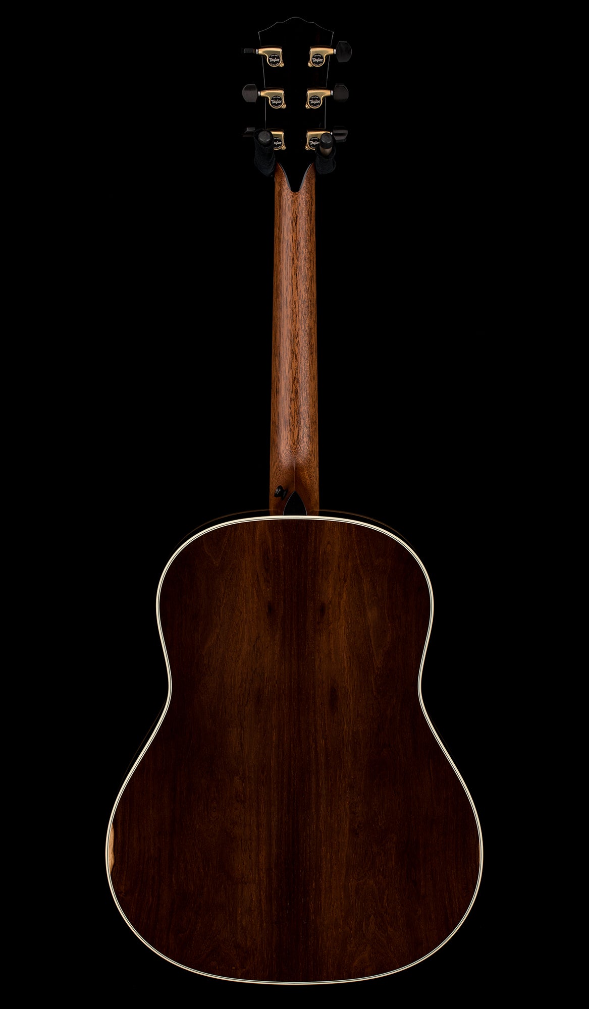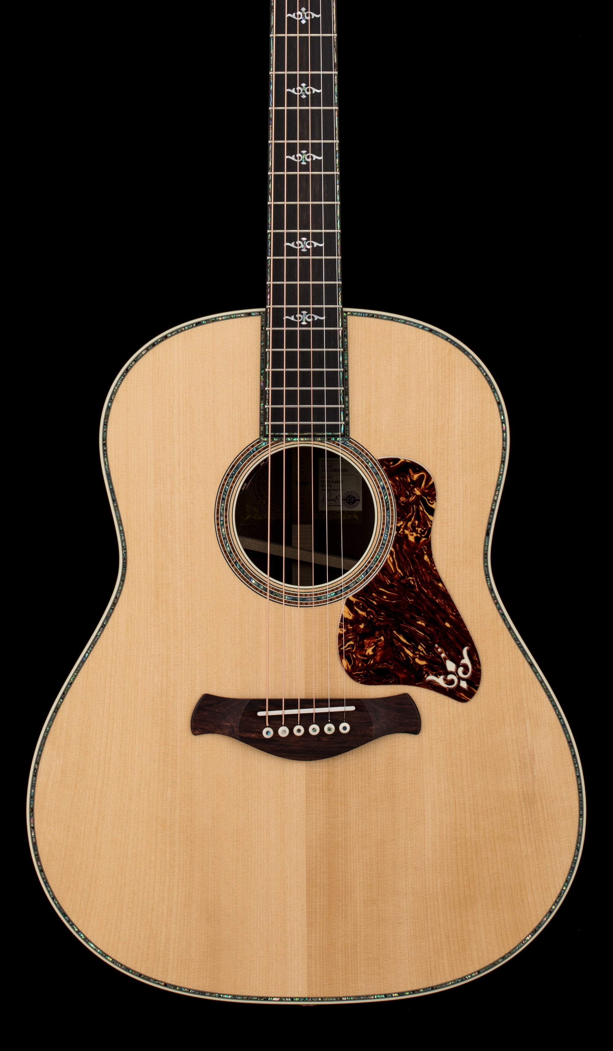 This model features a modified peghead shape with an angled-back design, script-style Taylor logo and paua purfling that culminates in a distinctive visual flourish at its crown. Other aesthetic touches include a full-body gloss finish, new paua/mother-of-pearl Continental Deluxe inlays, a single-ring paua/Honduran rosewood rosette, a Honduran rosewood curve wing bridge, bone bridge pins, grained ivoroid binding, and paua fretboard and top purfling. Equipped with LR Baggs Element VTC electronics and Gotoh 510 antique gold tuners with ebony buttons, this model comes in a deluxe hardshell case with a British Cocoa exterior.