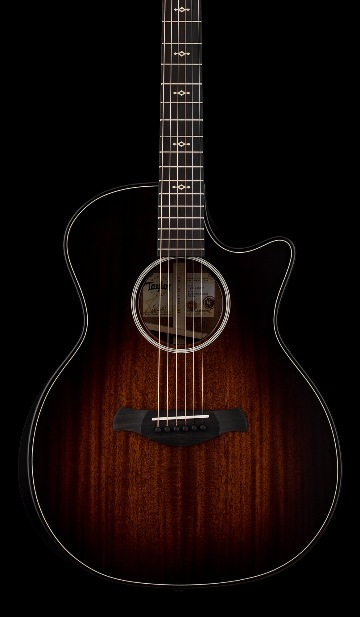 With a suite of updates to complement its array of comfort-enhancing features, the Builder's Edition 324ce offers a newly refined take on a versatile Grand Auditorium guitar. This model boasts back and sides of solid sapele paired with a mahogany top, yielding a hefty midrange punch with a focused, balanced character and controlled overtones. Inside, a scalloped take on Taylor's V-Class bracing architecture dials up improved volume, sustain and harmony between notes across the fretboard. Other upgrades include a long-tenon Action Control Neck that enhances resonance while offering unprecedented adjustability so you can achieve the perfect feel, as well as new Claria electronics with an intuitive mid-contour control that makes it easy to get perfect plugged-in tone for amplified scenarios. Other details include chamfered body edges, a beveled armrest and cutaway, Weathervane inlays in grained ivoroid, and a satin finish with a Kona burst color for the top and back.