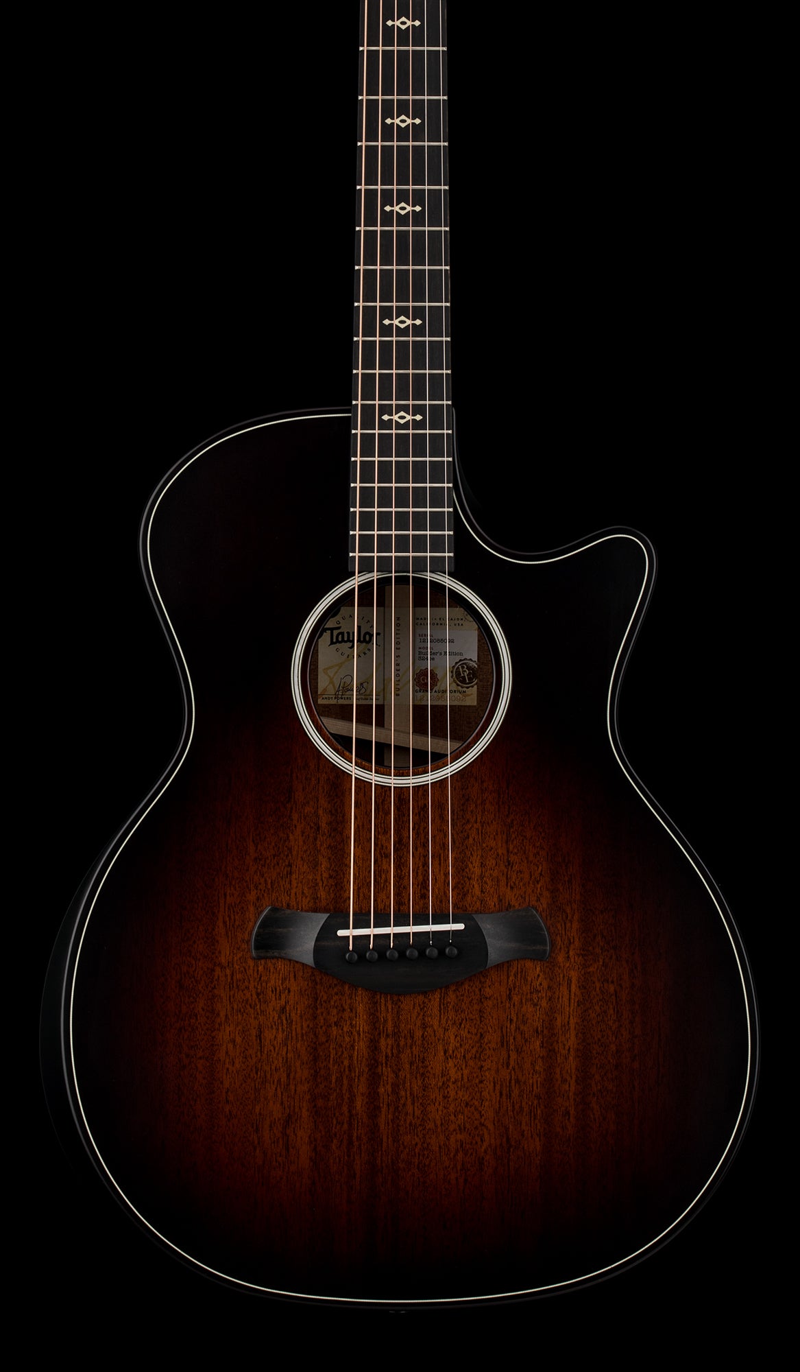 With a suite of updates to complement its array of comfort-enhancing features, the Builder's Edition 324ce offers a newly refined take on a versatile Grand Auditorium guitar. This model boasts back and sides of solid sapele paired with a mahogany top, yielding a hefty midrange punch with a focused, balanced character and controlled overtones. Inside, a scalloped take on Taylor's V-Class bracing architecture dials up improved volume, sustain and harmony between notes across the fretboard. Other upgrades include a long-tenon Action Control Neck that enhances resonance while offering unprecedented adjustability so you can achieve the perfect feel, as well as new Claria electronics with an intuitive mid-contour control that makes it easy to get perfect plugged-in tone for amplified scenarios. Other details include chamfered body edges, a beveled armrest and cutaway, Weathervane inlays in grained ivoroid, and a satin finish with a Kona burst color for the top and back.
