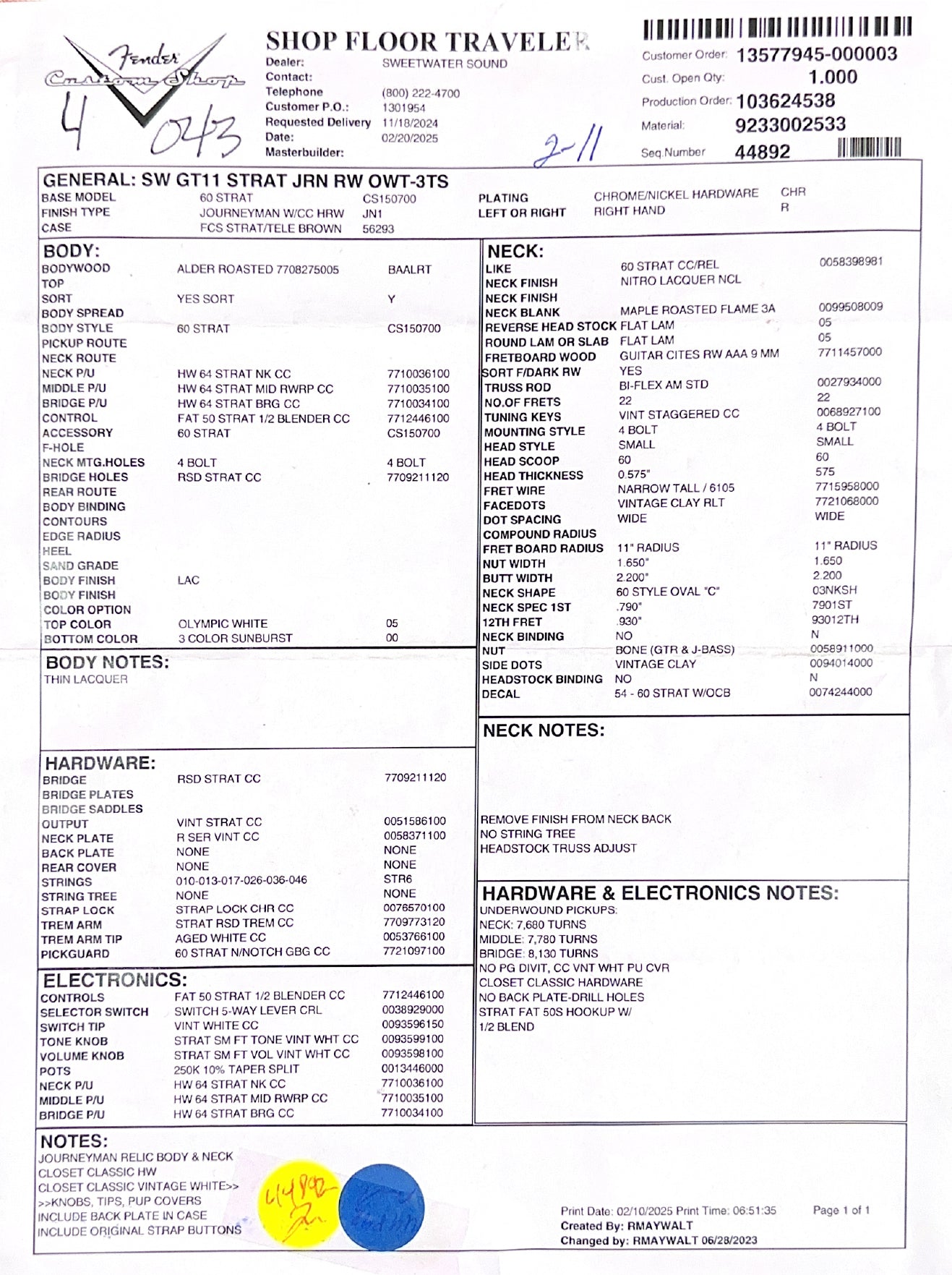 Used Fender Custom Shop Sweetwater GT11 Stratocaster Journeyman Relic (2025) - Olympic White/3-Color Sunburst #41567 with Original Hard Case