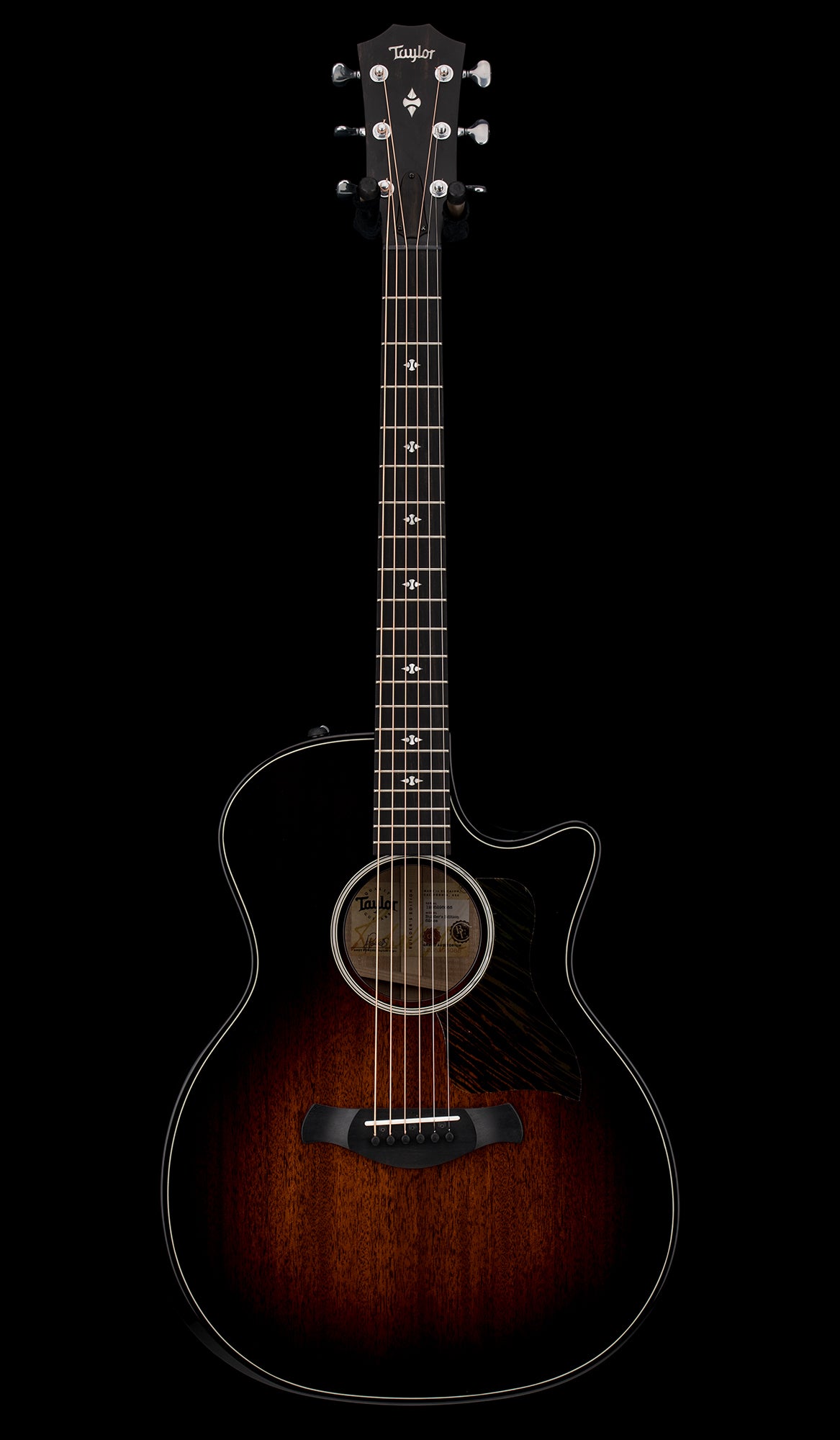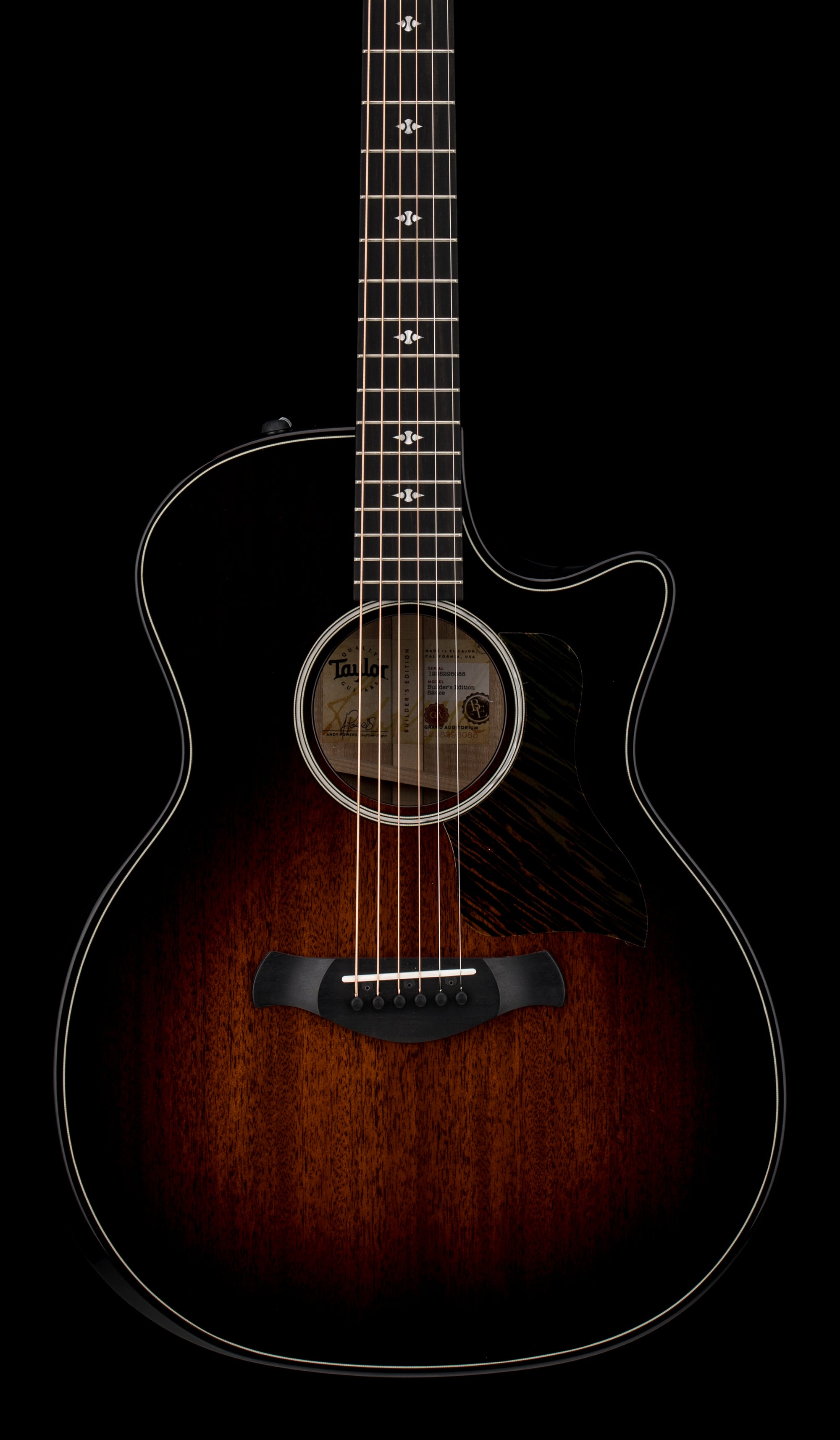 This versatile Builder's Edition 524ce Grand Auditorium, like Taylor's popular Builder’s Edition 324ce, boasts a solid mahogany top that adds midrange character and a bit of natural compression to its sound. The entire guitar features a Kona burst for a dusky, alluring aesthetic.
