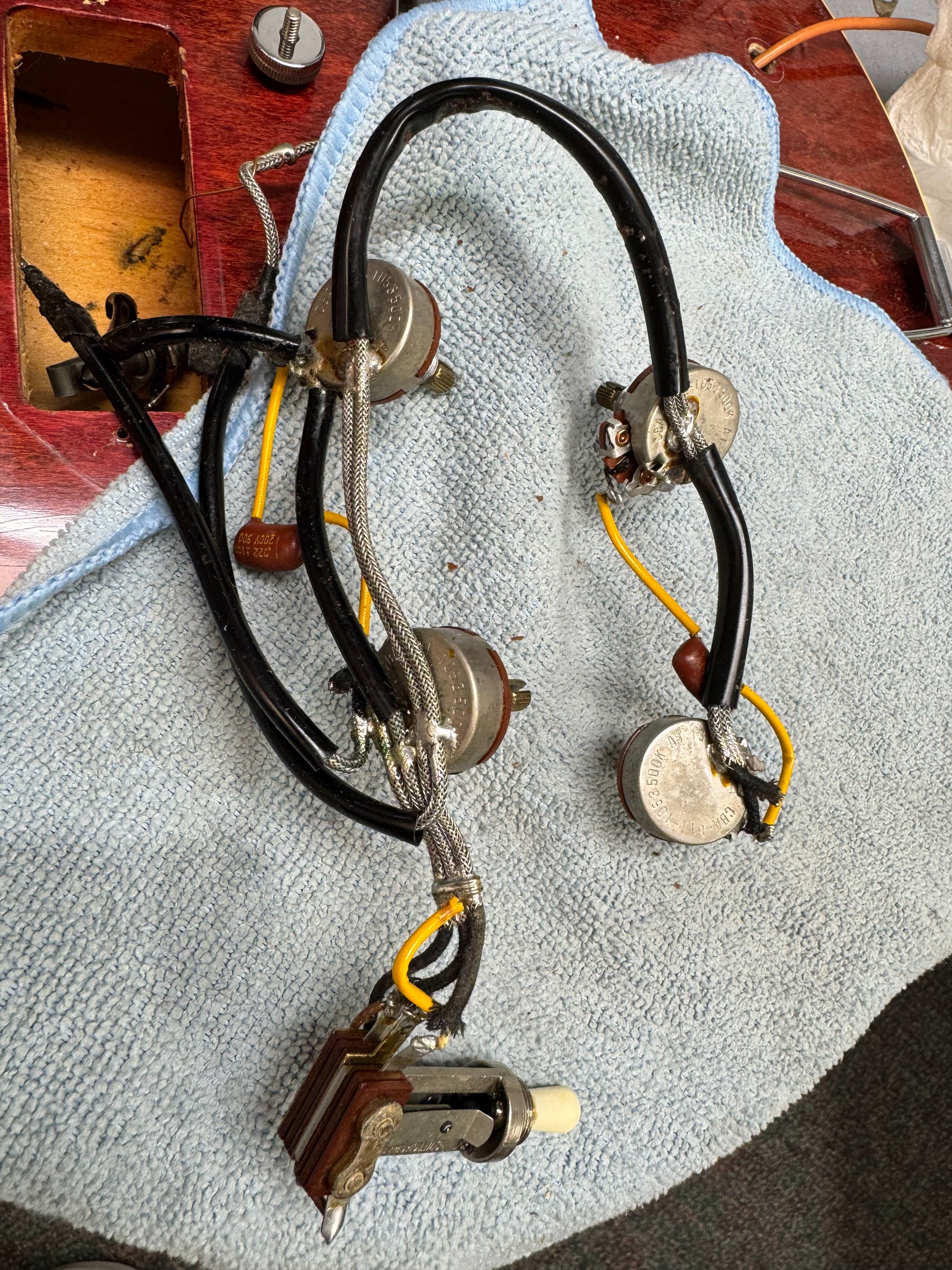 The finish has beautifully darkened, and has subtle checking throughout that is only visible in bright lights. It has typical wear expected from a guitar this age with some finish wear, scratches, scuffs, chips, and impressions. The original case left marks in the finish that are mostly visible on the back of the guitar. The original and a modern Gibson case come with it. Overall this 1966 ES-330TDC is in great playing condition making it ready for the studio, the stage, or solely as a collection piece.
